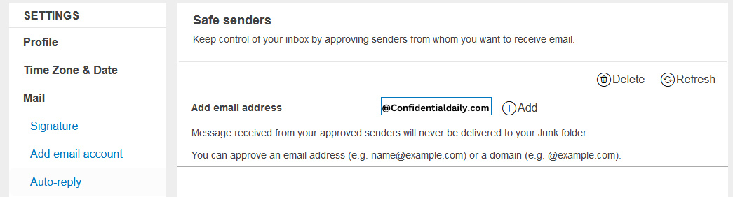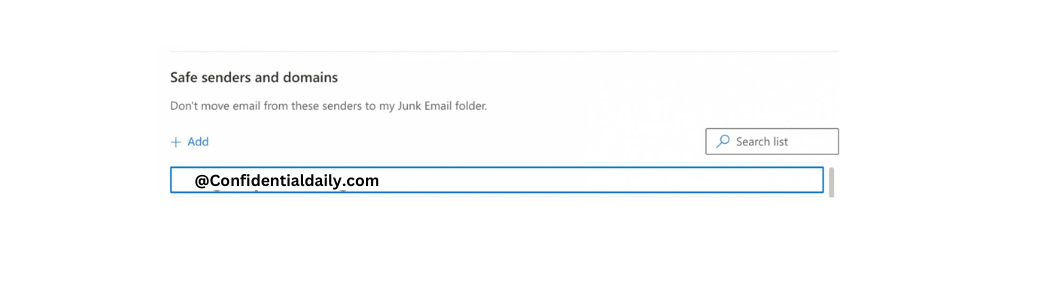 3) To add an entry to ‘Safe senders and domains’, click on the ‘Add’ button and type confidentialdaily.com to mark as safe every incoming email from Confidential. Then press ‘enter’ to save change