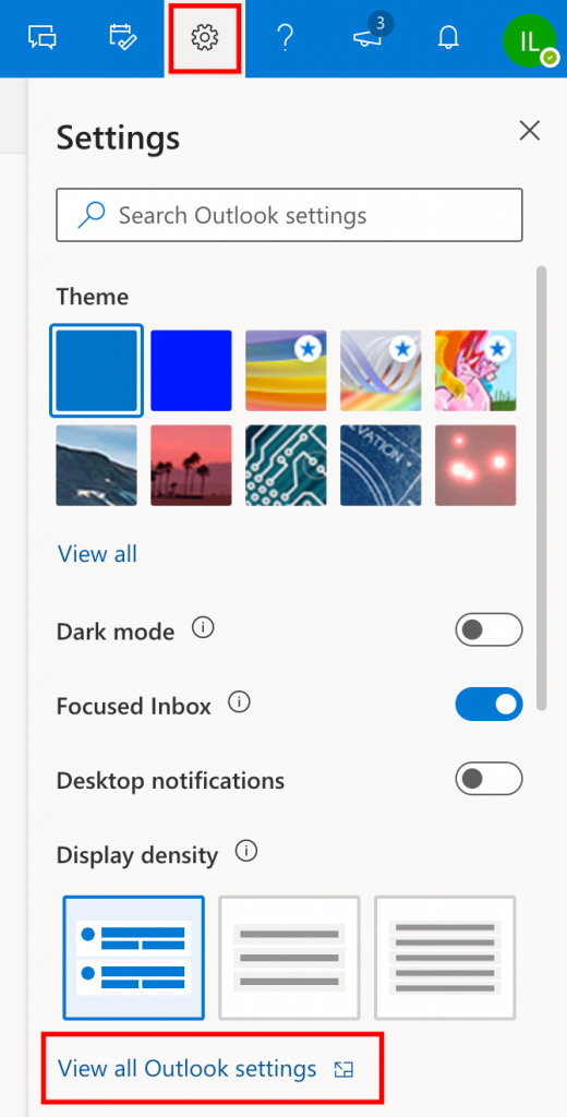 1) In your inbox, find and click the gear icon. Then “View all Outlook Settings”:
