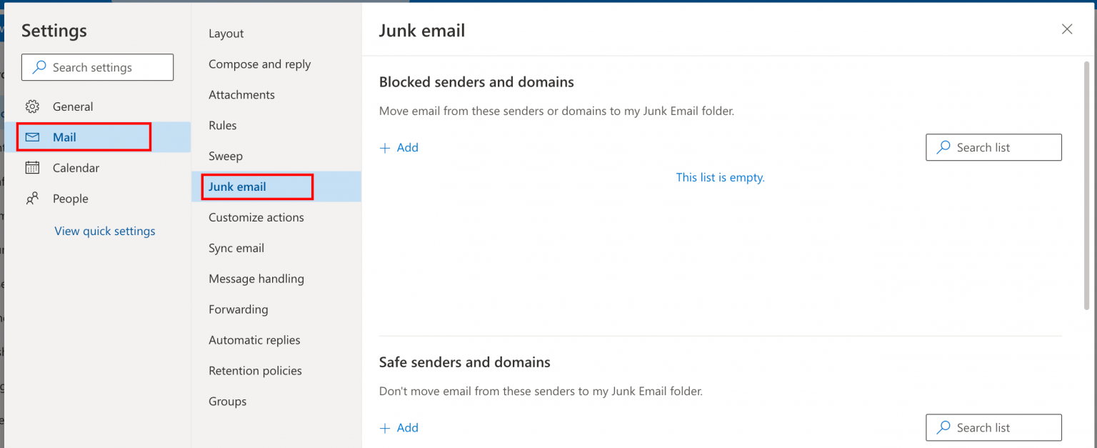 2. On the left, right under SETTINGS, click on “Mail” and then click on “Safe Senders”.