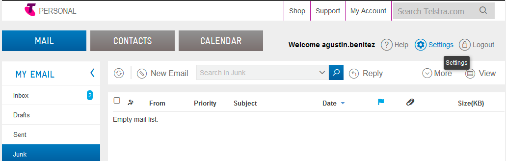 1. Login to your Bigpond mail. On the upper right hand of the screen, click on the gear icon that reads “Settings”.