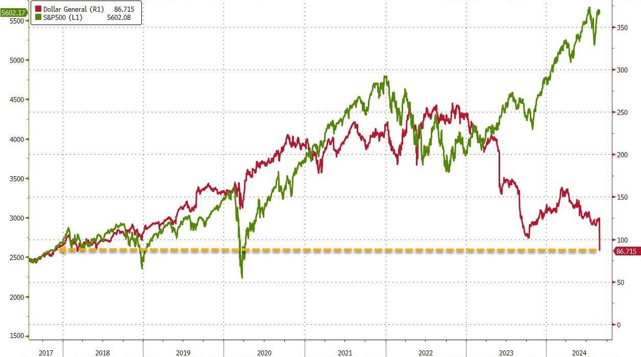 which of course is a total joke when one considers the record implosion in ultra discount retailer Dollar General - which now caters to not just the lower class but also a substantial portion of the "middle class" - which suffered its biggest market cap drop on record, and sent its stock price to 6 year low!