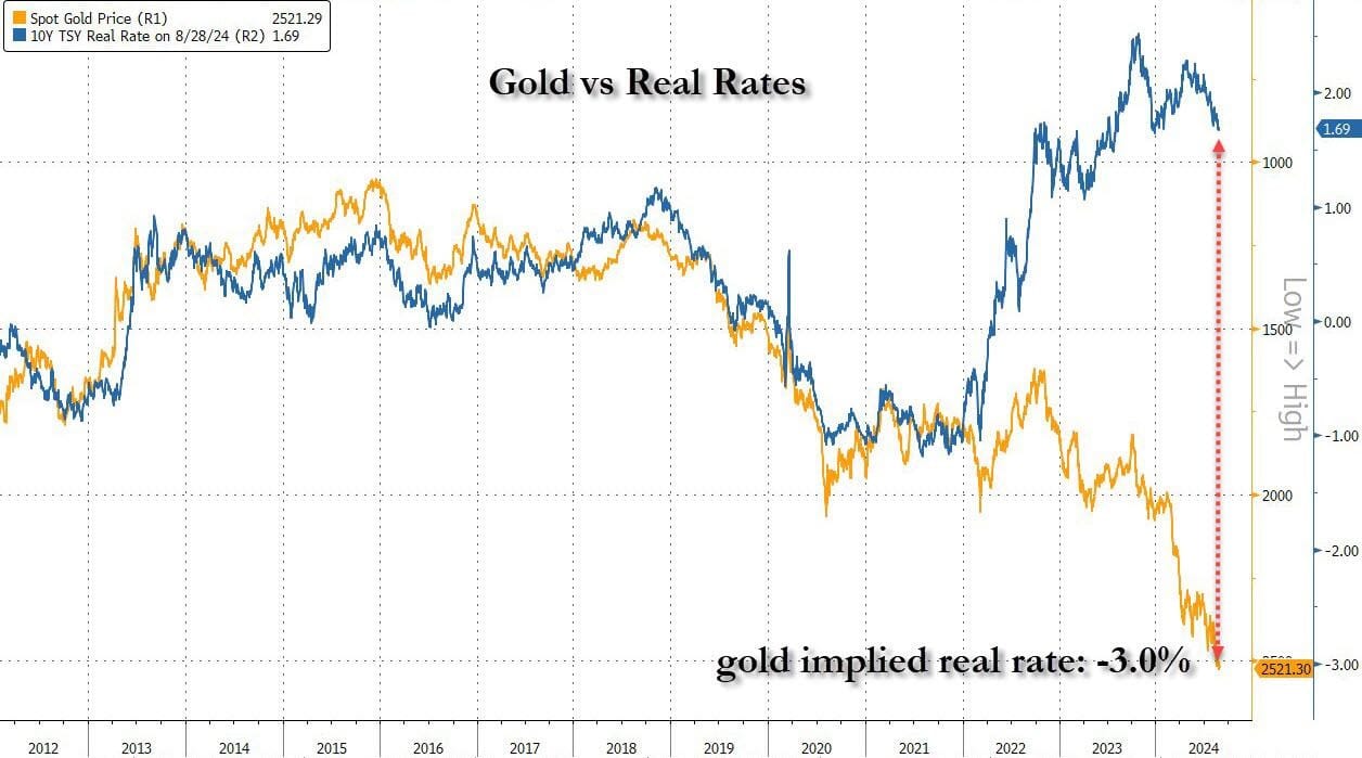 The above Dollar General chart of course reeks of massive fiscal or monetary looming stimulus, whether it is under president Kamala or Trump, something which gold is clearly sniffing out as it hits another record high of USD$2,553.80, and strongly suggests that real rates should be about 4.5% lower, at -3.0%!