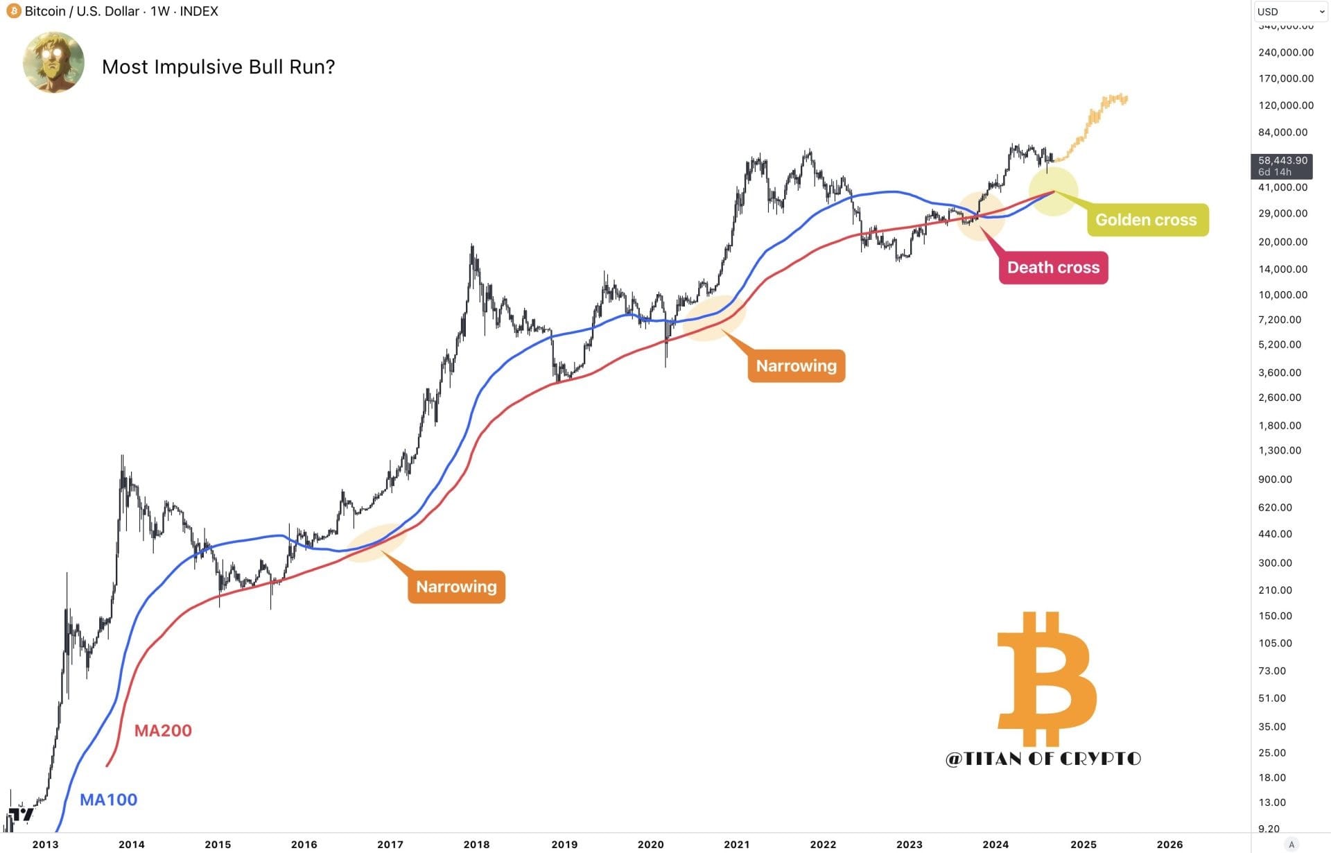 The tweet, accompanied by a detailed chart above, underscores the occurrence of a “Golden Cross” between the 100-day (MA100) and 200-day (MA200) moving averages. As Titan of Crypto suggests, this event could herald one of the most substantial bull runs in Bitcoin’s history.