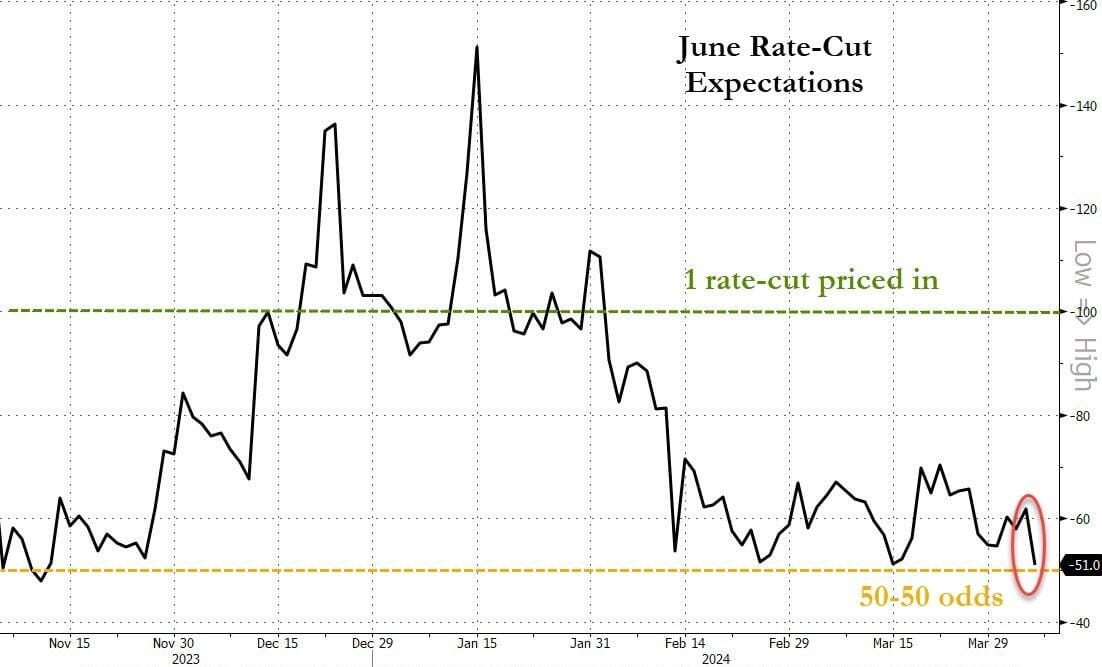 Of course, good news is bad news for the doves and rate-cut expectations for 2024 are down (particularly after today's big payrolls headline beat) well below three cuts expected by the 'median' Fed dot and the odds of a cut in June have tumbled back to a coin-toss!