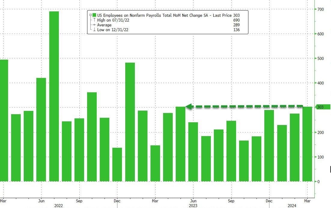 Sure enough, the illegals won again when moments ago the BLS reported that in March, the US added a whopping 303K jobs, tied for the highest since Jan 2023!