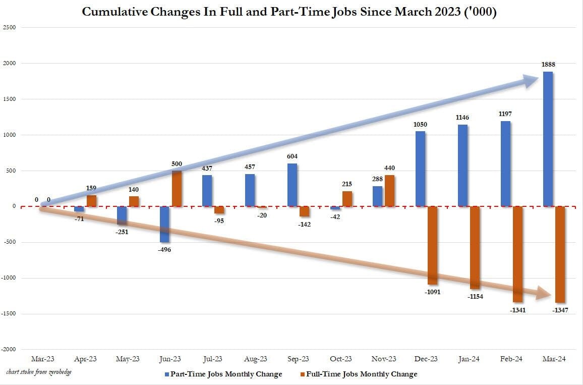 Here is exhibit A: in March, the number of part-time jobs soared by 691K to 28.632 million, up from 27.941 million while full-time jobs dropped by 6,000, to 132.940 million from 132.946 million.