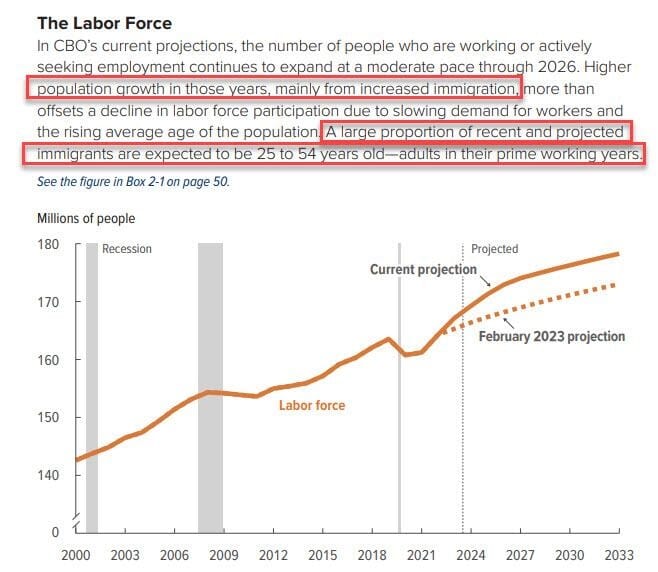This is how CBO Director summarized it: "as a result of those changes in the labor force, we estimate that from 2023 to 2034, GDP will be greater by about $7 trillion and revenue will be greater by about $1 trillion than they would have been otherwise."
