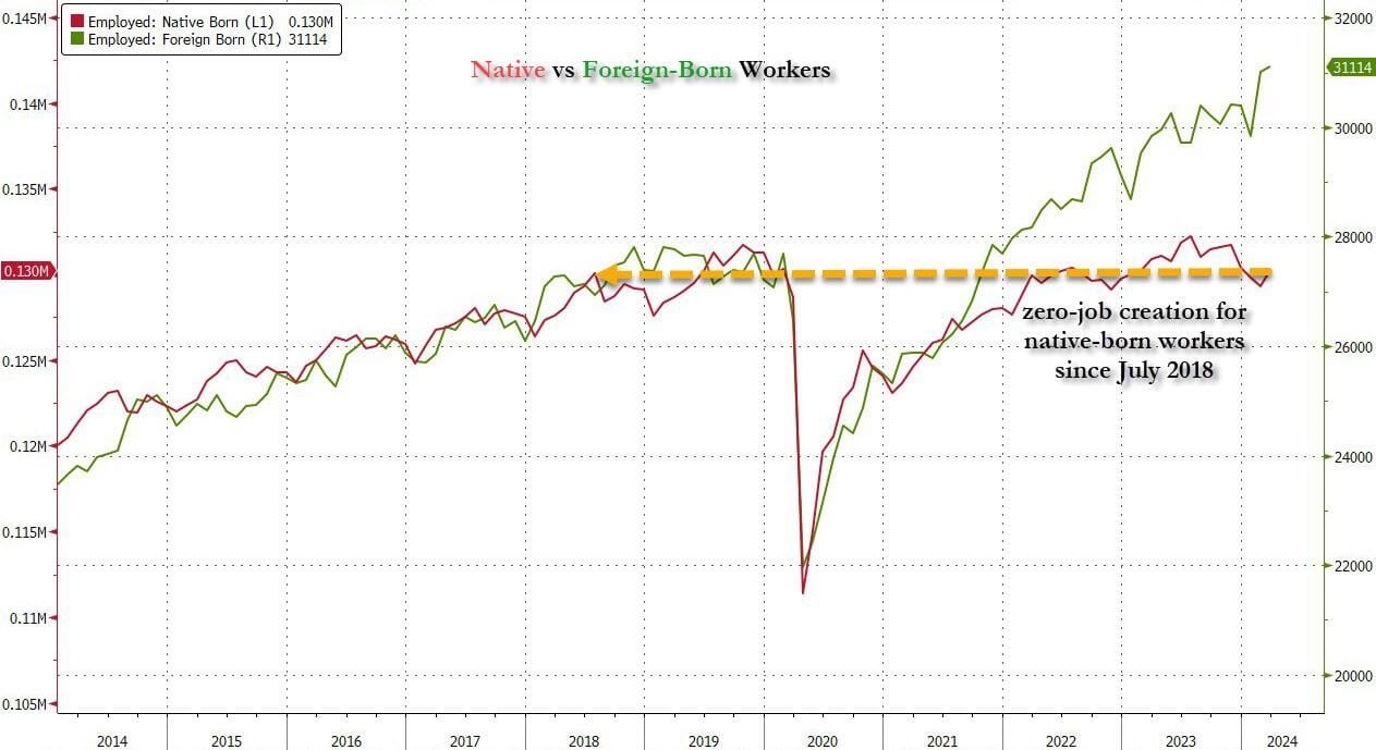 ... but there has been zero job-creation for native born workers since July 2018!