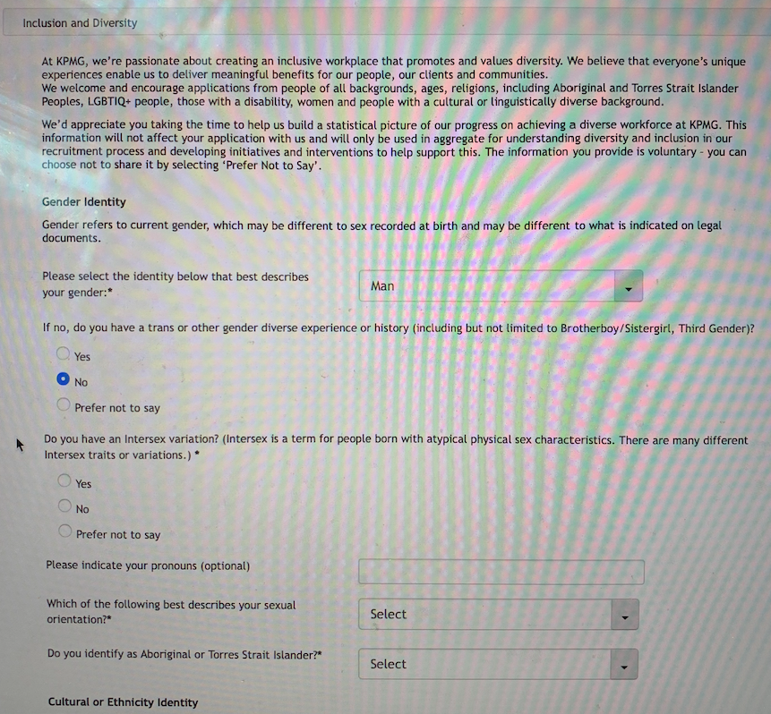 Why else would consulting firms like KPMG ask about gender, pronouns or sexual preferences in their application process?
