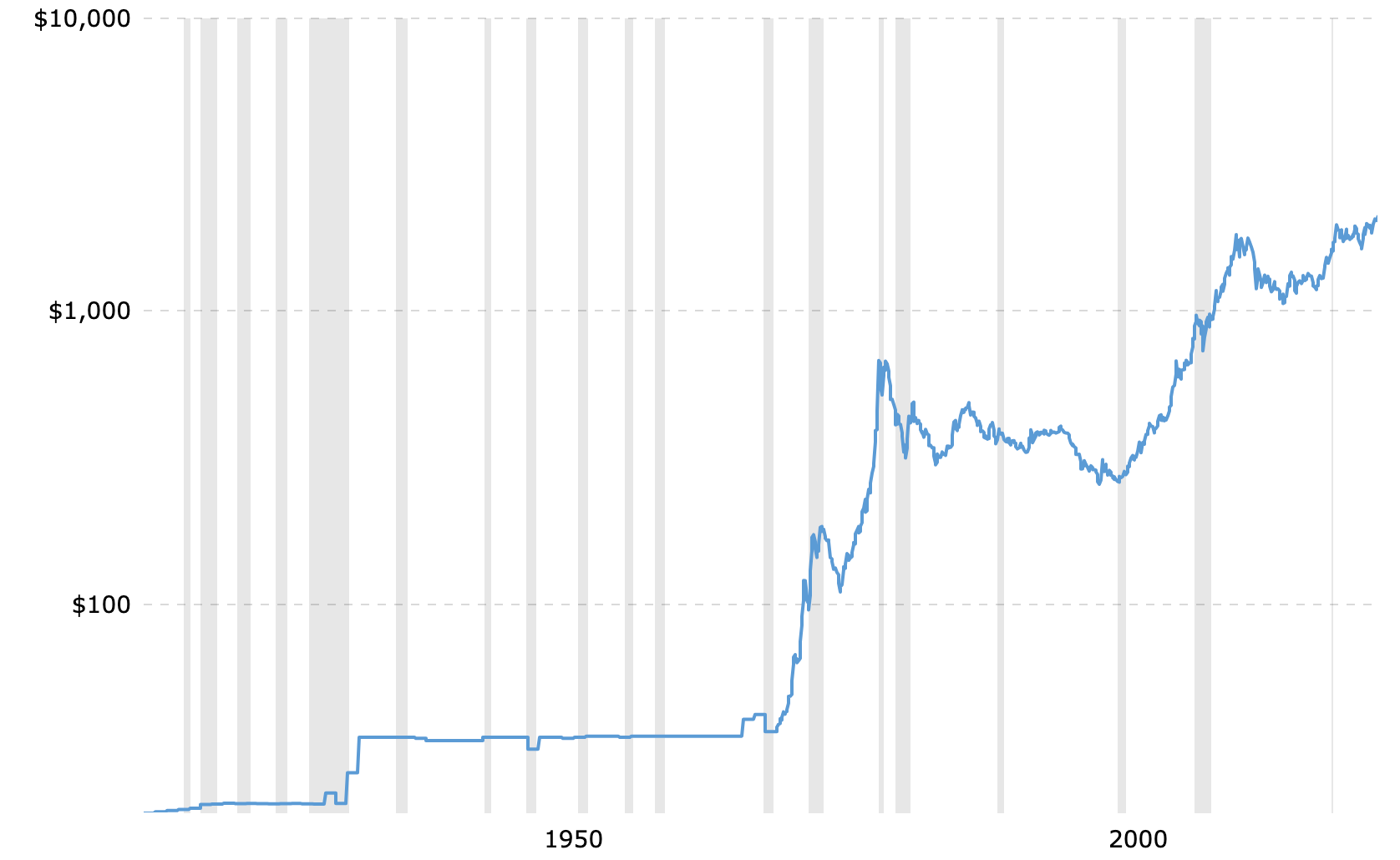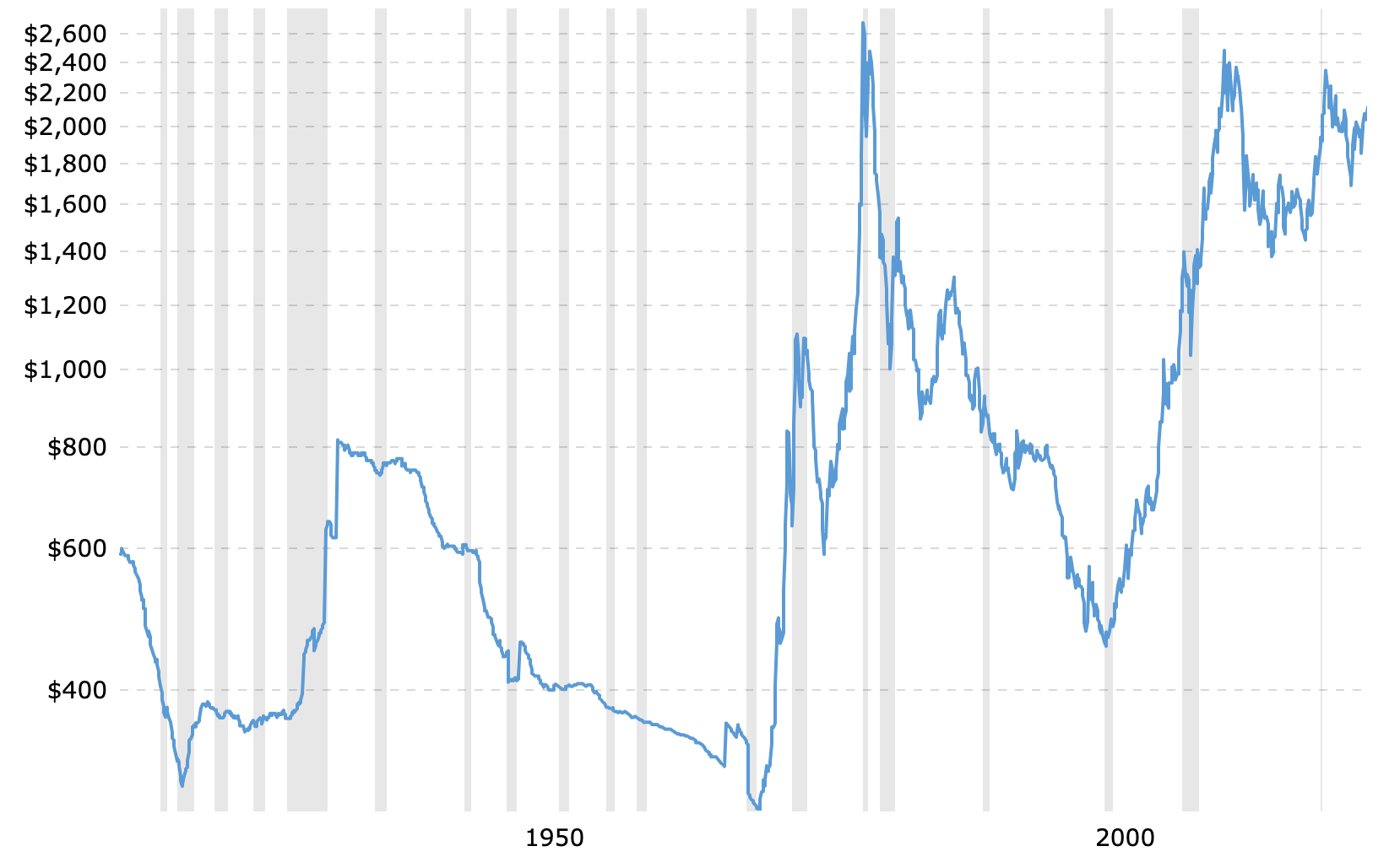 Gold prices in absolute terms (left) and in inflation-adjusted USD. The grey bars are recessions.
