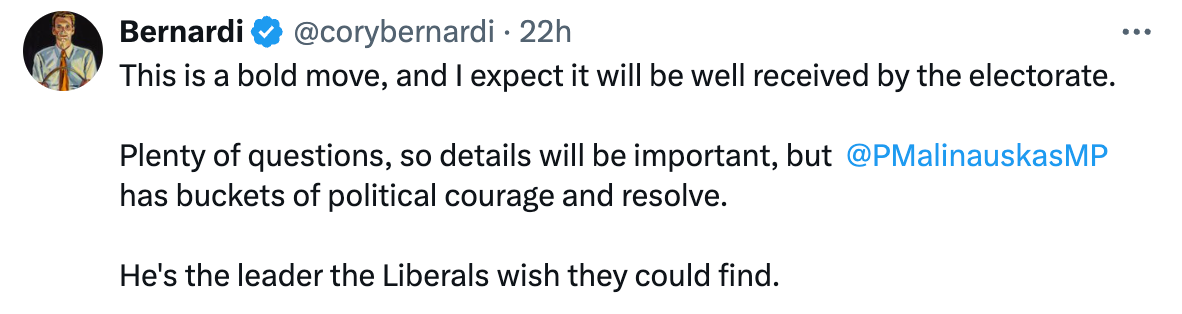 I said as much on X when I saw the news, and for the record, the leadership mention was a reference to the hopeless former SA Premier Marshall and the completely useless SA Liberal Party.