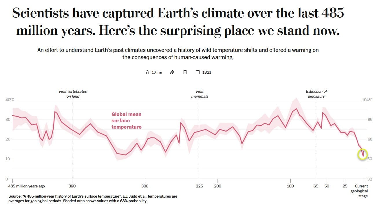 Now the NYT were covering a report entitled A 485-million-year history of Earth’s surface temperature .