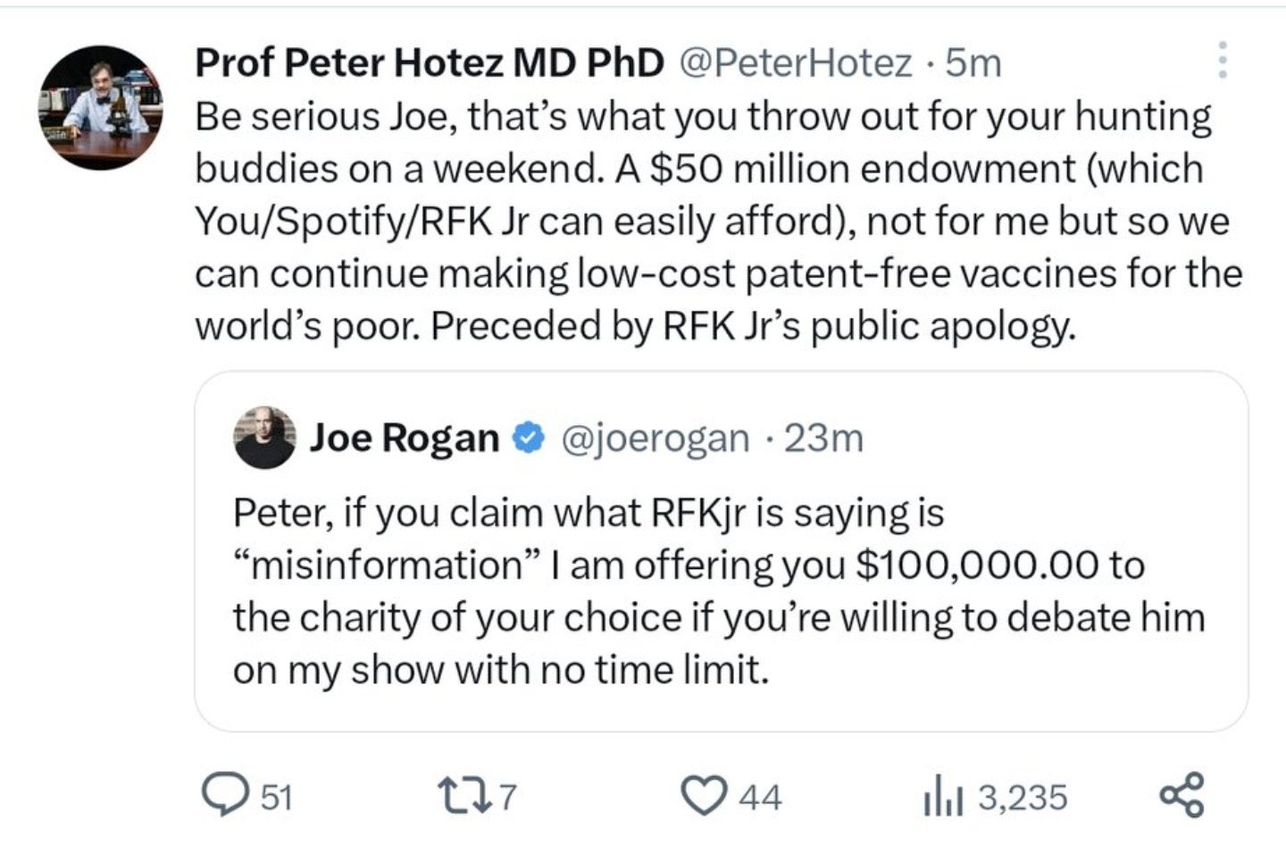 This is how the challenge started with Rogan offering $100K and Hotez demanding $50 million.